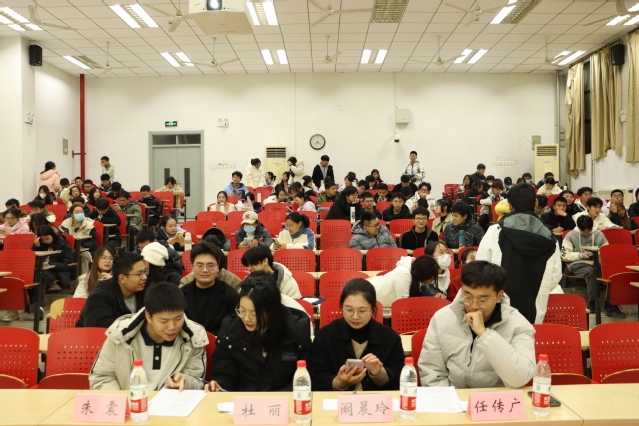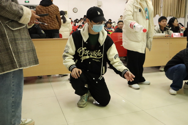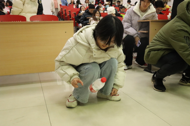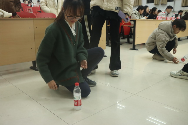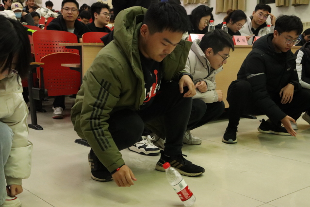 “趣味水瓶”的游戏规则为各组派代表至讲台前,将下发的一瓶矿泉水抛至空中,使之能够成功直立在地板上,限时两分钟,比拼成功立住瓶子的次数。该活动十分考验同学们对水量的合理把控,抛水瓶的动作也颇具技巧,找好合适角度,便可以大大提高成功率。活动现场热闹非凡,场下的同学不断练习、不断调整,场上的同学沉着应对、冷静抛掷,每个小组都在为了取得更好的成绩努力着。