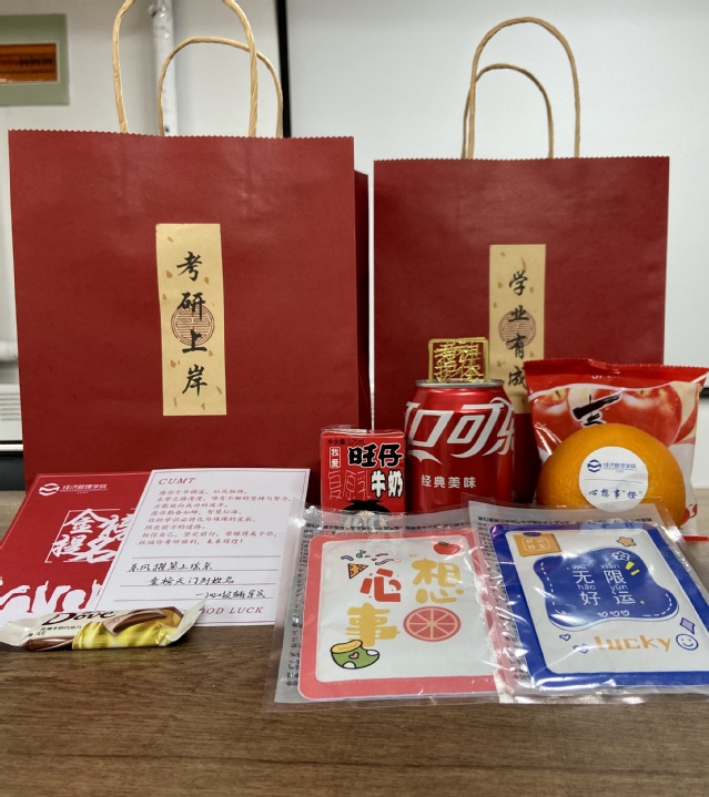 收到考研加油大礼包后,同学们备受鼓舞,纷纷表示将拿出最好的状态应考,不辜负学院的殷切期待,用优异的成绩回报学院的培养。赵禧月同学表示:“收到礼包的时候真是既惊喜又感动,在12月这个关键节点每天的压力都很大,忽然收到学院送来的礼物让我有了“雪中送炭”的感觉,礼包里面从各种零食水果以及贴心的暖宝宝到来自辅导员老师亲手写的祝福贺卡,各种小惊喜都给我这个考研人带来了很大的支持,非常感谢学院的鼓励!”
