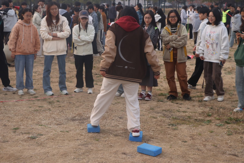 “摸石过河”项目则是要求裁判发令后,队员依次将河石踩在脚下交替向前行进。赛程为 N 米(根据场地大小而定),每名队员需要到跨过另一侧端线以后再折返回起跑线,然后下一名队员接力继续。这个项目考验的是同学们的策略和团队协作能力,大家通力合作,勇创佳绩。