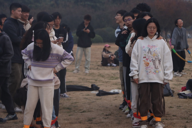 “多人多足”项目是最后一个项目,也是最具挑战性的一个项目。同学们需要十个人一组,相邻同学的左右脚绑在一起,然后在规定的时间内走完一段距离。这个项目考验的是同学们的默契程度和团队协作能力,伴随着一声声“左”、“右”,同学们愈发默契,移动的速度也是越来越快。