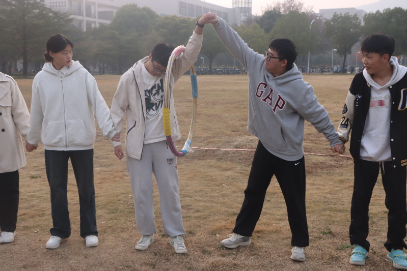 “穿针引线”项目则是要求同学们8人手拉手围成一排,用身体传递呼啦圈。这个项目考验的是同学们的耐心和团队协作。同学们通过不断的尝试和调整,最终成功完成了任务。