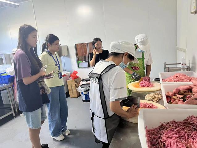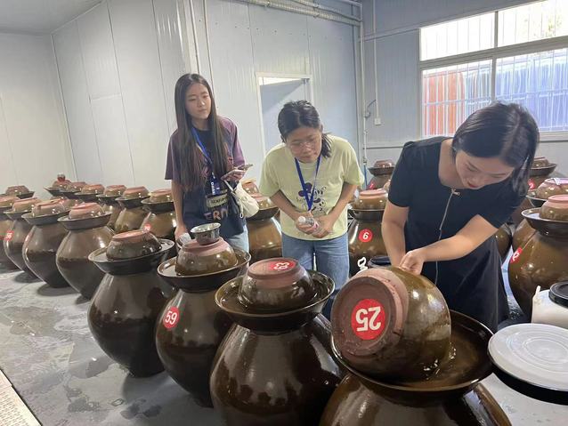 随后,叶明艳女士带领实践团成员来到了泡菜加工间,实践团成员看到工人们在车间中有条不紊地对萝卜、长子豆等进行切条、切块和腌制。在这之后叶明艳女士向实践团成员展示了腌制完成的泡菜成品。
