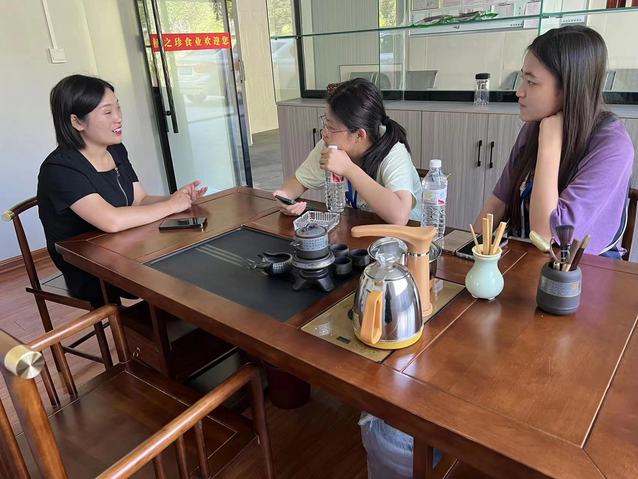 接着,实践团成员来到会议厅对叶明艳女士进行了采访。叶明艳女士表示,在岚皋经营富硒绿色食品的加工生产企业有多个原因:一是想要让家乡的农副产品走出大山,帮父老乡亲把农副产品卖出去,实现增收。二是积极响应国家关于“加快发展乡村特色产业,因地制宜发展多样性特色农业”的号召。“丹心”实践团成员在对叶明艳女士的提问中,了解到了栖之珍食业有限公司的销售途径十分丰富,除了传统的对接批发市场、餐饮渠道等,还有对接电商平台的新零售渠道,包括在“县长直播间”中售卖产品。同时,叶明艳女士还开拓了新消费渠道:通过自媒体运营如“两微一抖”(微信、微博、抖音)等,来开发自己的私域流量从而获得订单。