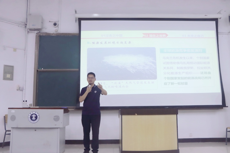 会议伊始,贺瀚老师从过去之中国、现在之世界、未来之自己三个方面进行讲述,分析了宋清二朝局势、近代中国曲折的救国之路、在党带领下的中国现代化建设、当今世界一超多强的格局、经济和能源的国际局势等问题,指出当前我国处于近代以来最好的发展时期,世界处于百年未有之大变局,各位同学应不断学习、严格要求自己,精进前进,为实现“两个一百年”奋斗目标、实现中华民族伟大复兴的中国梦而奉献自己的一份力量。