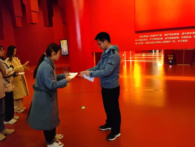 活动中,全体员工党员跟随讲解员走过各个展厅,认真倾听淮塔故事,从解放军“行军迈大步,越走越出路......”的口号中感悟先烈不畏牺牲、无私奉献的战斗精神,从乡村动员“男女老少一齐动手,一面生产一面支前”的口号中了解到人民群众的支前精神,还从那满墙的红色文书、战斗勋章、破损的枪支中感受那段艰辛岁月的奋进精神。随后在党员代表张浩然带领下,全体党员面向党旗庄严宣誓,声音传遍了红色宣誓厅的每个角落。最后学院团委书记贺瀚为2021级的预备党员发放预备党员接收书,并号召大家了解革命历史、弘扬革命精神,把握规律、奋发有为,增强自信、敢于争先。