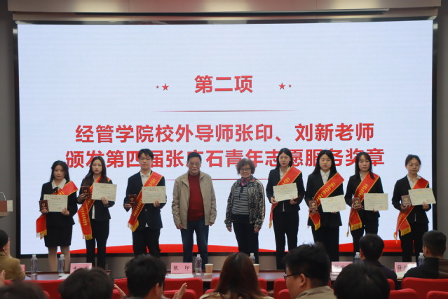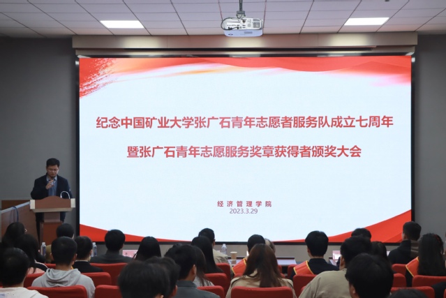 经管学院校外辅导员老师张印老师在会上作了《发扬张广石精神,做有志气、骨气、底气的新时代青年》报告。首先张印老师表达了对张广石青年志愿者服务队的肯定,然后向同学们详细阐述了张广石精神并辅以事例。张印老师激励同学们成为有志气、有骨气、有底气,心怀理想的对祖国有用的人才,并对矿大学子寄予厚望。最后张印老师演唱了一首《祖国不会忘记》以缅怀为祖国矿业事业付出一切的人。接着,经管学院校外导师张印、刘新老师一起为第四届威廉希尔williamhill官方网站张广石青年志愿服务奖章获得者颁奖。