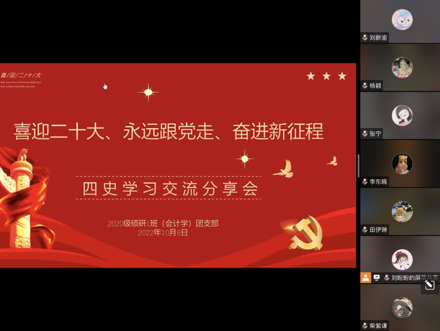 在遵守学校疫情防控政策的前提下,威廉希尔2020级、2021级、2022级研究生各团支部积极参与,在活动期间以团支部为单位,由团支部书记主持,采取线上、线下或二者相结合的方式开展主题班会,包括多种活动形式,如理论学习、观看红色影像、阅读四史书籍、四史学习知识竞赛、看图讲故事、合唱红歌、分享红色旅游经历等,有的支部还邀请辅导员杨世勇老师、兼职辅导员张晓媛老师出席活动。