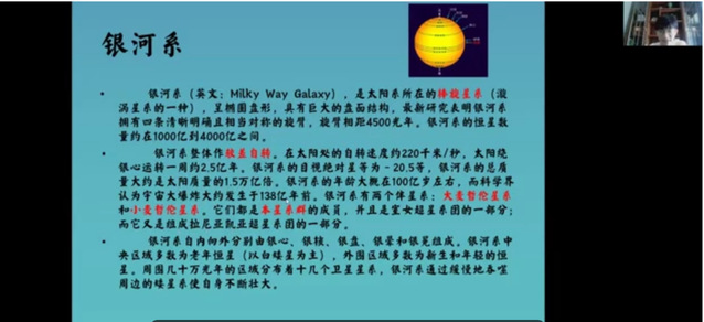 课程开始,吴天宇对银河系进行详细介绍,银河系是太阳系所在的棒旋星系,包括1000--4000亿颗恒星和大量的星团、星云以及各种类型的星际气体和星际尘埃。此外,他还讲述到银河系中的地球在宇宙中只是一粒微尘,并以视频的方式形象地给大家展示了宇宙之大和从中子到可观测宇宙的对比变化。接着,吴天宇向大家介绍了星系和星系的分类,讲到了数千万颗的矮星系与恒星的椭圆星系以及星系的大小和星系群与星系团的概念界定,星系的主要类别有椭圆星系、螺旋星系和不规则星系。课程最后,吴天宇向同学们介绍了地外生命的概念,他告诉孩子们不要局限于我们已经观测到的世界,浩瀚的宇宙中还有很多未知的东西值得人类去探索。