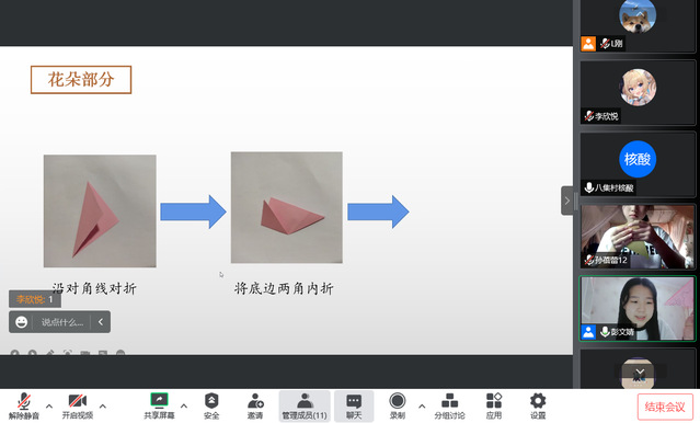 首先,彭文婧向同学们介绍了裴浩正、罗曼·迪亚兹和罗伯特·朗三位折纸艺术家,并通过视频的方式对其中两位进行了详细讲解。为了更好的和同学们互动,彭文婧还根据视频的内容进行了针对性提问,同学们都积极地参与讨论并回答。随后,彭文婧介绍了世界十大名花,美丽奇异的花朵很快吸引了孩子们注意力,由此激发了同学们对花朵折纸的兴趣。紧接着,她将折纸拆分成多个步骤进行演示,以帮助同学们更好地理解和掌握。在老师的耐心指导下,同学们折出了带有五彩花瓣的花朵,并积极发表了自己对折纸的想法。其中,李欣悦同学表示:“只要跟着老师的步骤一步一步来,就可以折出好看的花朵,我还想尝试更多折法。”最后,彭文婧又展示了川崎玫瑰等其他花朵的折法,并鼓励同学们在课下多进行练习,尝试更多折法。