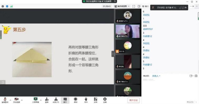 8月8日晚8时,在第一次折纸课中,志愿者彭文婧以“科学中的的手工”为切入点,向同学们介绍了手工的概念和手工的作用价值。随后,她还带领同学们观看了皮卡丘的相关视频,并指导同学们折皮卡丘。8月12日晚7时,在第二次授课中,志愿者彭文婧对上节课内容进行了简要复习,随后便开始了彩色花朵折纸教学。在彭文婧的鼓励下,同学们主动分享了自己的折纸心得,李欣悦同学表示:“花朵折纸有很多折法,学习了本节课的基础折法以后就可以折出更多好看的花朵。”