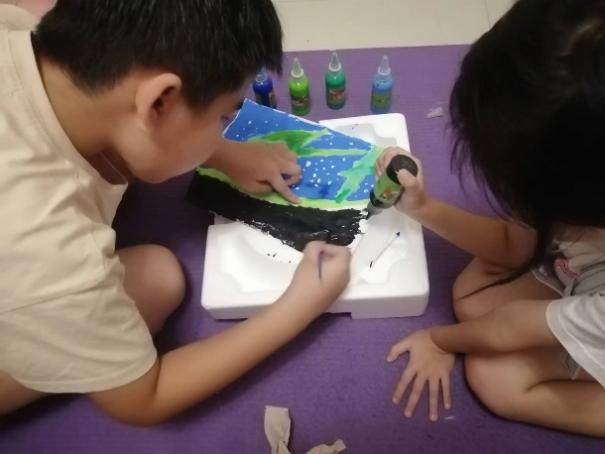 、颜色、出现位置、形成原因等,并用视频短片的形式向小朋友们展示了极光的魅力。随后,他便开始引导同学们如何去绘画极光。在绘画期间,刘思宇不断对细节加以指导,最后小朋友们终于画出了自己的极光。