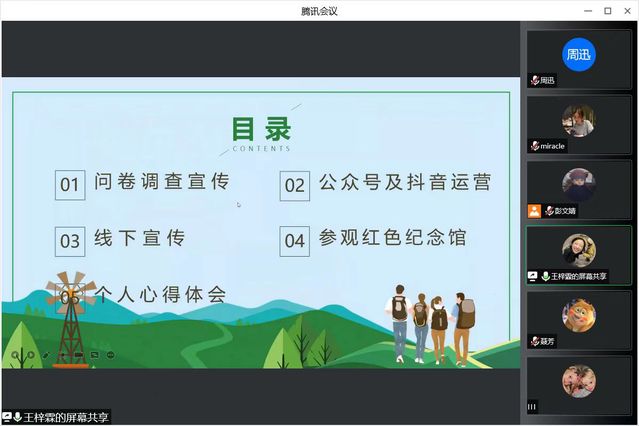 会议开始后,队长彭文婧首先介绍了实践团的基本情况及实践团前、中、后期的主要工作任务。接着,她详细说明了实践团在各个时期的实践工作成果并通过视频短片向社区群众展示了实践活动的具体过程。随后,实践团成员依次发言,畅谈了实践过程中的收获与感悟。成员江鑫慧说道:“本次实践锻炼了我的数据分析能力和写新闻稿的能力,同时我也深刻认识到了党史宣传的重要性。”最后,队长彭文婧分享了团队的微信公众号,呼吁大家多多关注后续发表的有关党史宣传的内容。