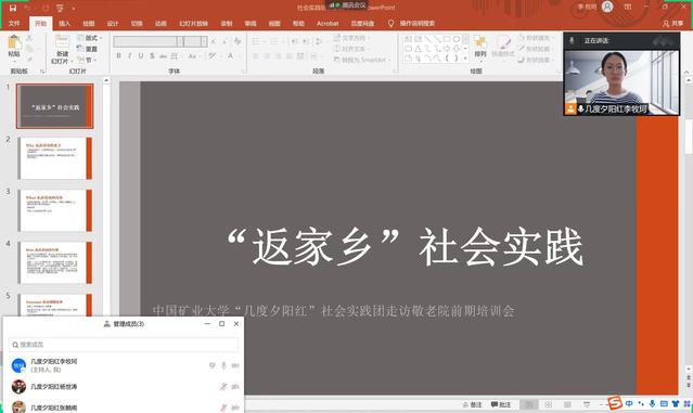 7月14日下午3时,实践团以线上方式举办了“走访敬老院老人,让关爱顺抚皱纹”社会实践活动动员会。会议由队长李牧珂主持,队员张麟阁撰写会议报告,全体实践团成员参与。会议介绍了此次社会实践活动的内容和具体安排,强调了关爱老人和深入基层服务的意义和价值。此外,主讲人李牧珂将实践活动分为老年人生活现状了解、敬老院实地调查、关爱老人实践三个板块,并结合实际情况对成员们进行了合理分工。