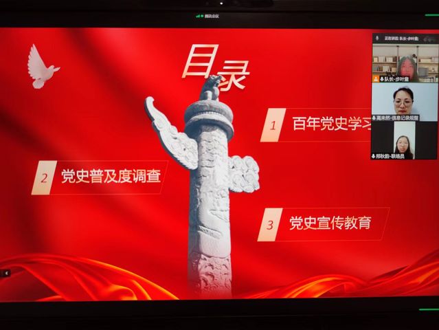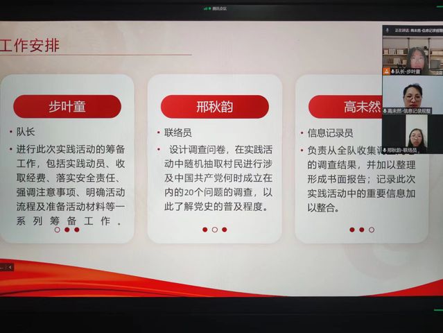 晚上8时,会议正式开始。首先,主讲人步叶童对本次社会实践的目的和意义进行了简要说明,并强调了党史宣传及教育的重要性。接着,她分别从百年党史学习、党史普及度调查、党史宣传教育三个板块内容进行了详细的介绍,并详细部署了此次社会实践的内容和分工安排。最后,步叶童表示,我们应当各司其职,协同配合,将党史宣传与教育活动办好,落到实处。